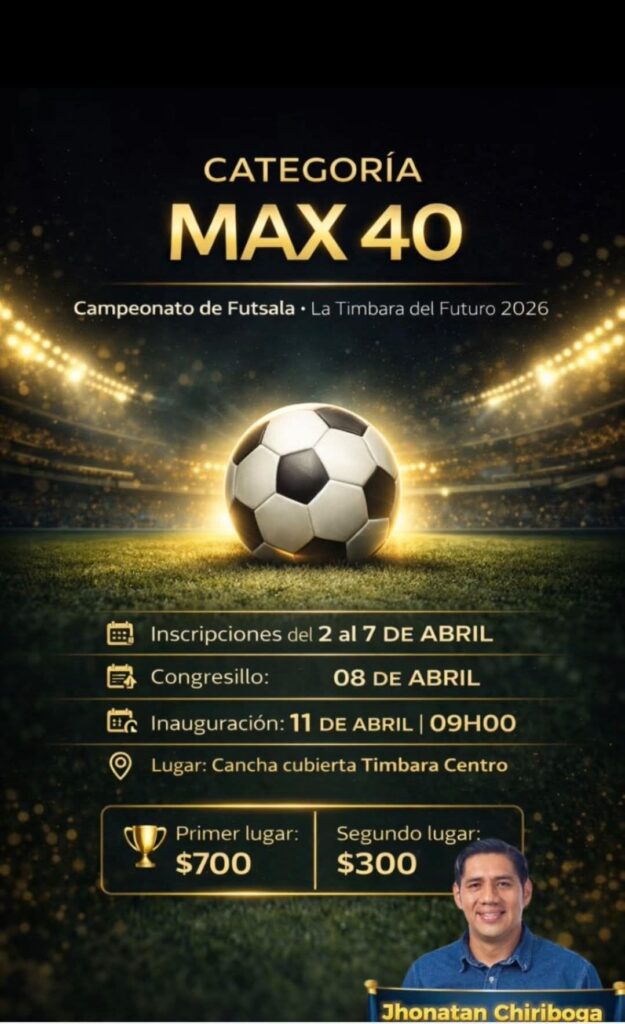 Extendemos la cordial invitación a todos los deportistas de las diferentes Parroquias, Cantón y Provincia de Zamora Chinchipe para que sean participes del Gran Campeonato de «FUTSALA MAX 40» En La Parroquia Timbara. INSCRIPCIONES ABIERTAS en la secretaria del Gad Timbara (0981514574) INICIO de inscripciones desde: Jueves 2 de Abril hasta el martes 07 de […]